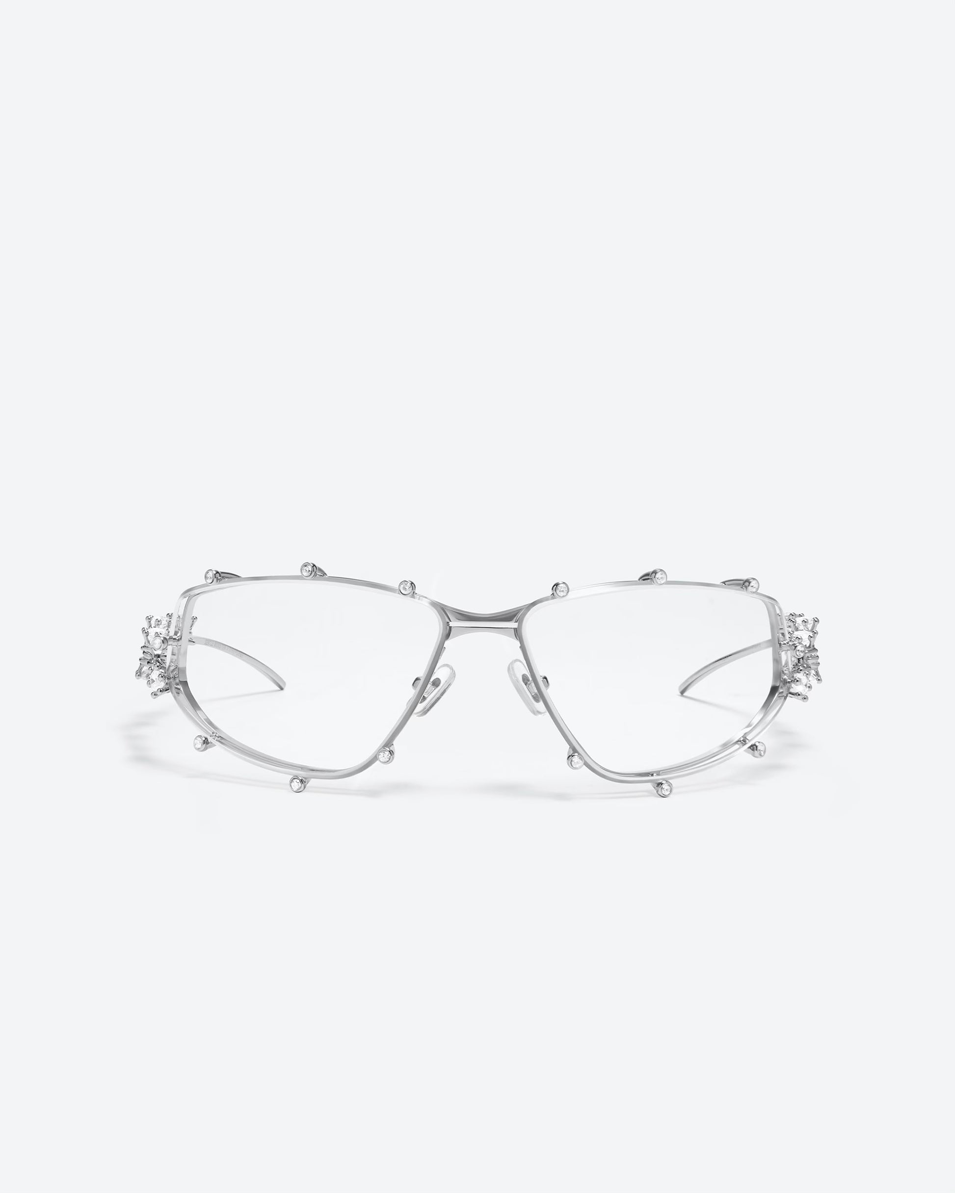 Discover Tiara 02 , featuring a square frame in metal, the front is adorned with exquisite pieces that evoke the design of a tiara. Fashionable jewelry details have been added to the temples in a witty and inspiring design, turning the frame into a piece of jewelry. The collaboration collection captures the two brands' perspectives on the concept of "found objects" to reinterpret timeless beauty with elegance, presenting a new category of fashion eyewear that celebrates unprecedented creative endeavors.