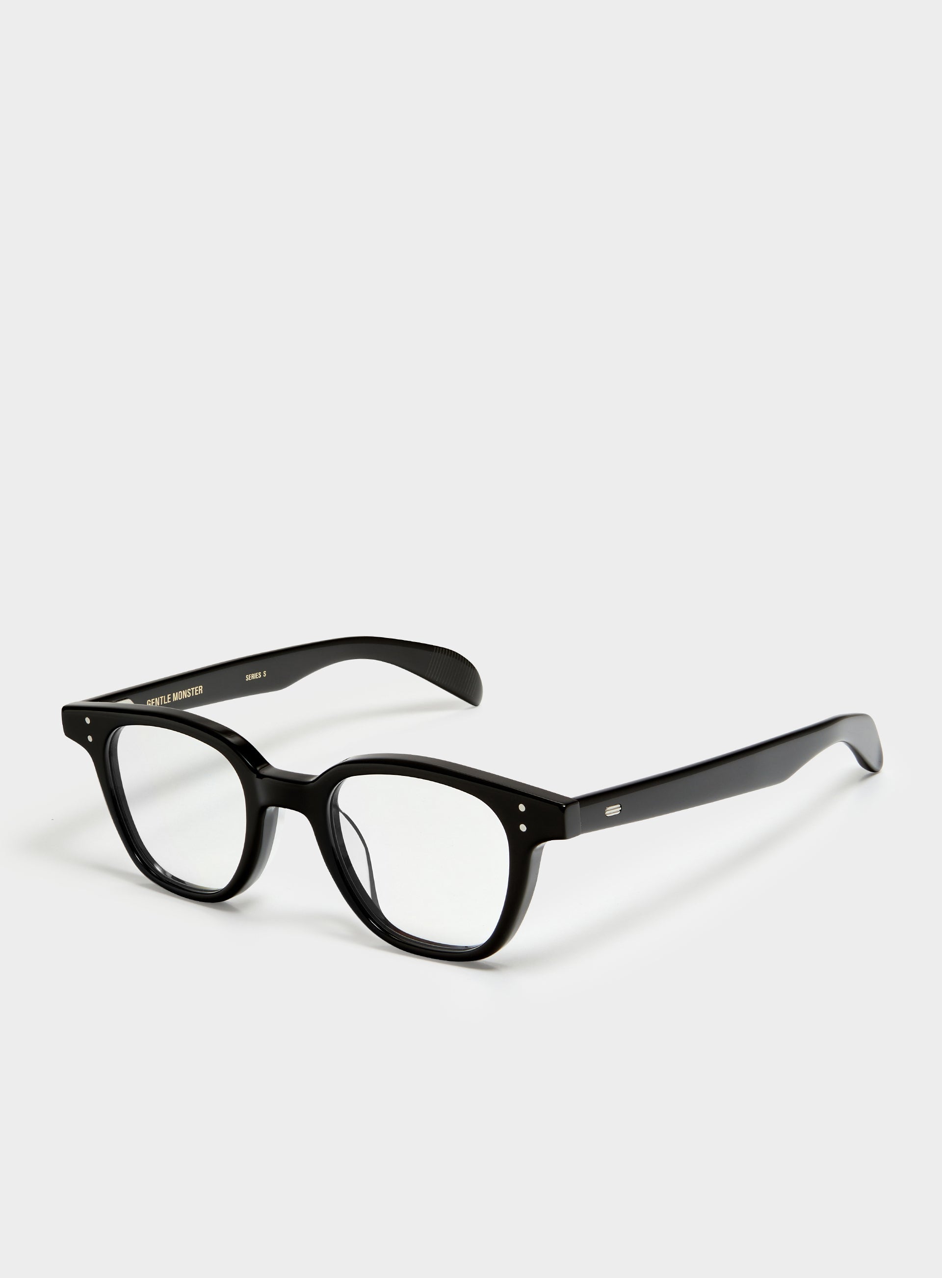 Dadio 01 is a square black acetate frame. Highlighted by the Wellington style inspired design along with circular studs on each side of the front and bold library temples, this frame is fitted with 99.9% UV protection and blue light filtering clear lenses.