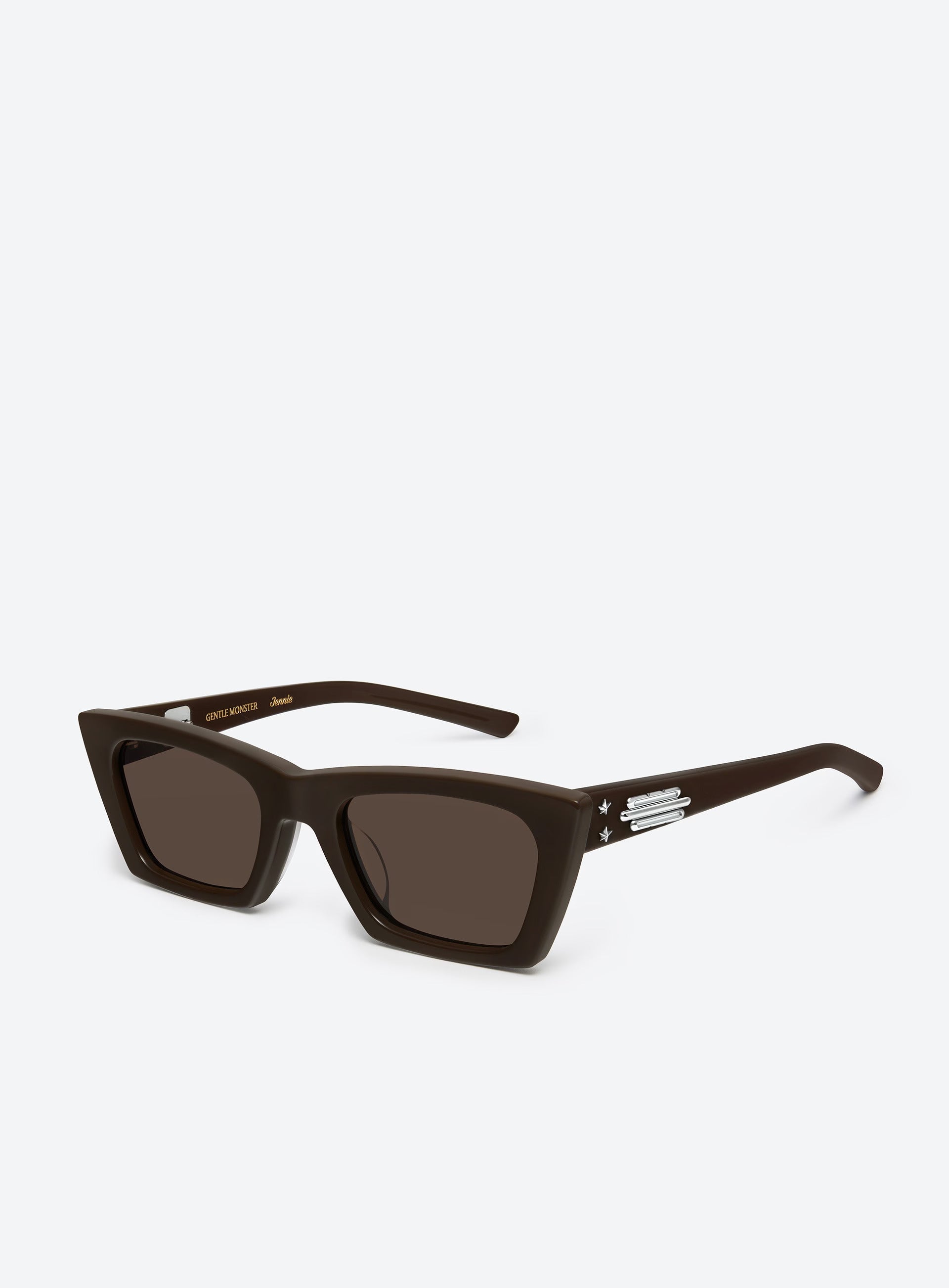 Discover the Baby Pony BR3 sunglasses from the Jentle Salon collection. The angular cat-eye shape blends seamlessly with the vintage chocolate brown color to create a sophisticated style while the iconic details on the temples add a captivating appeal. Complete the look using the collection's aesthetic charms - an expression of the creative encounter between Jennie's taste and Gentle Monster's imagination.