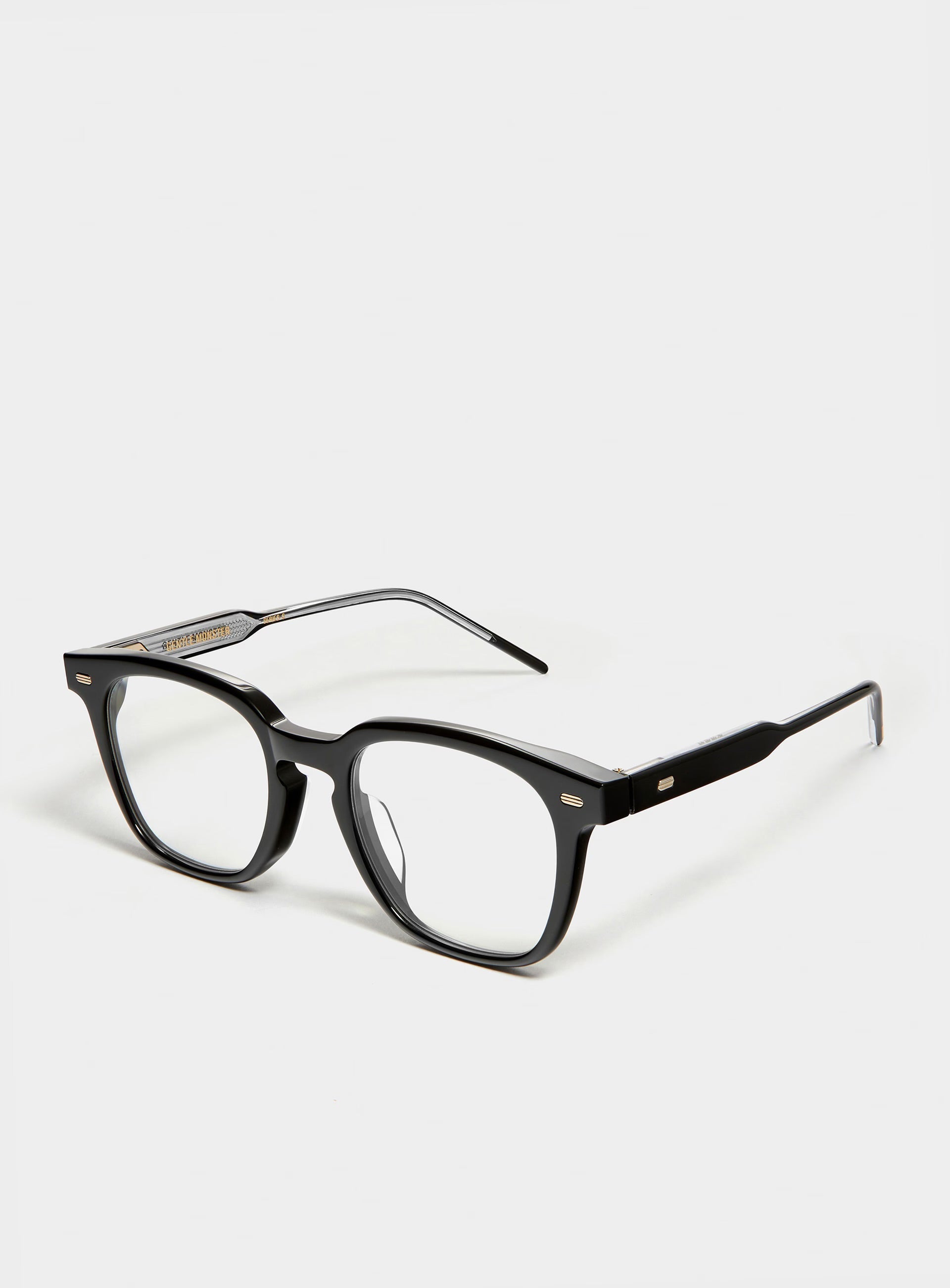 Kubo 01 is a black acetate frame that features an updated rendition of the Wellington style. This square frame is fitted with 99.9% UV protection and blue light filtering clear lenses and highlighted with a keyhole bridge and dual-colored temples.