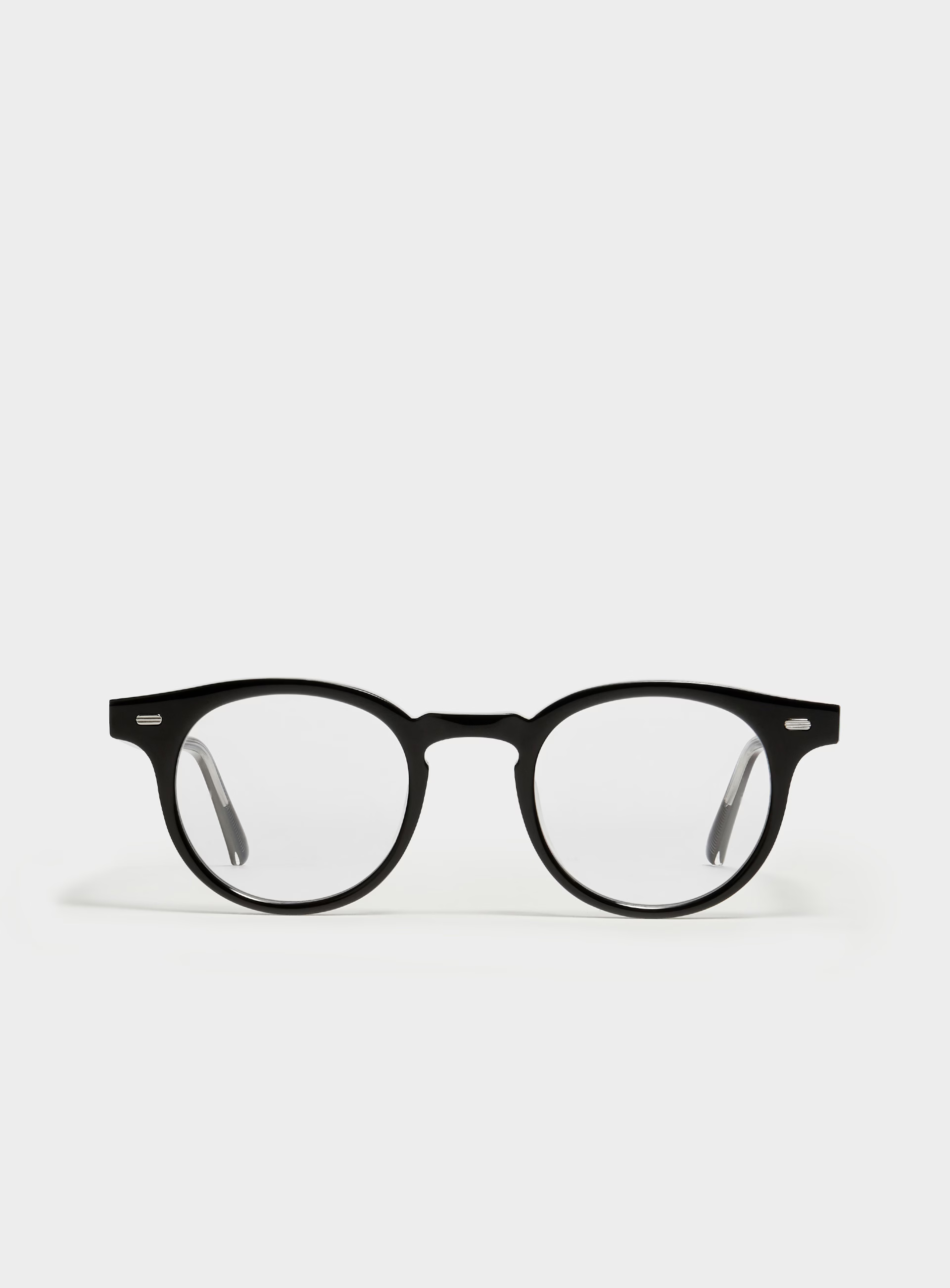 Milan A 01 is a round black acetate frame, an updated rendition of the Milan. Designed with the keyhole bridge of the classic Boston style, this frame features dual-colored temples and blue light filtering clear lenses with 99.9% UV protection.